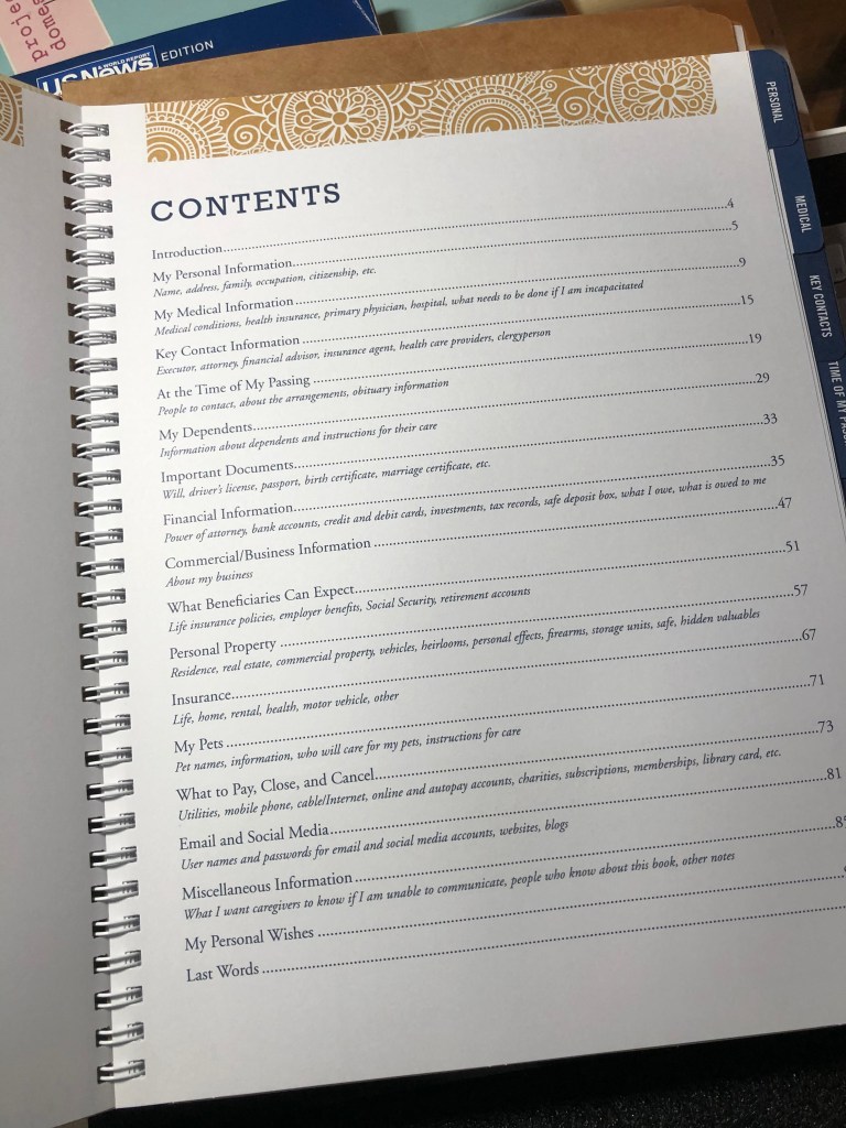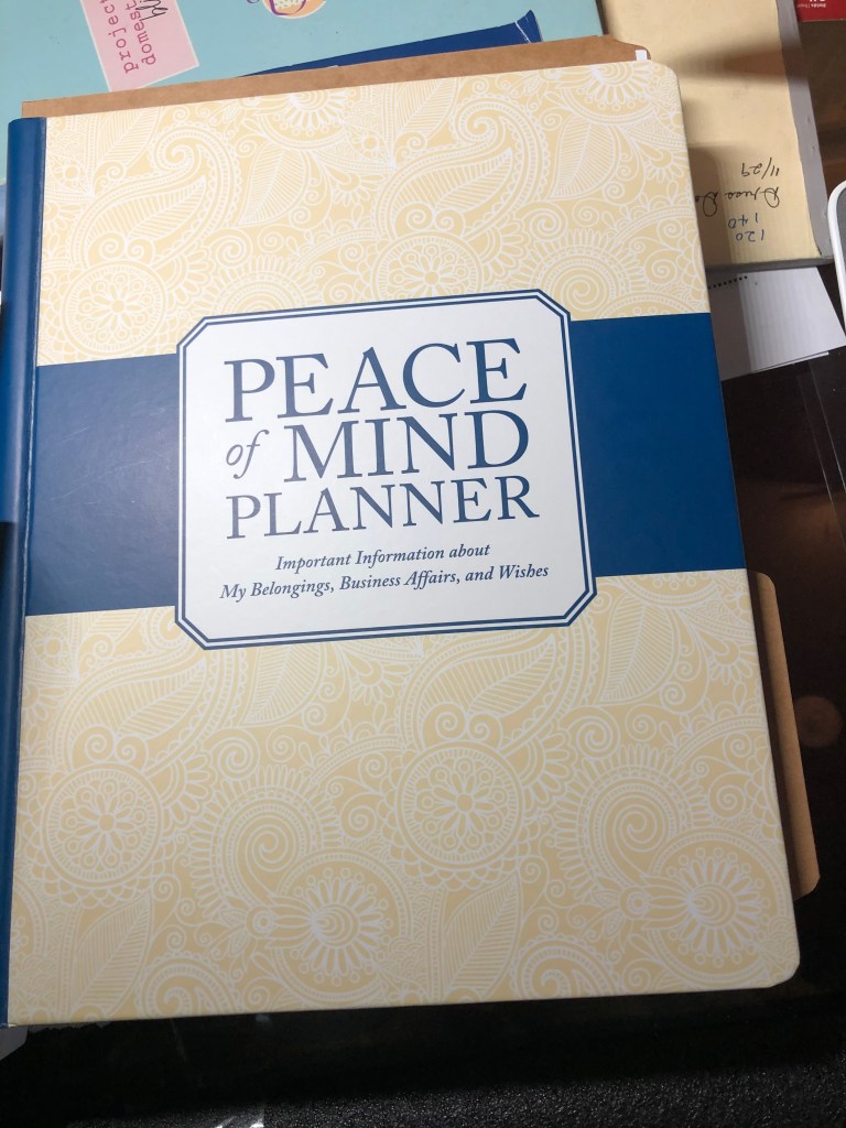 Anyhoo, the “Peace of Mind Planner” is a place to write and share important information about your belongings, business affairs, and wishes. The planner asks things like your post office box number. My family doesn’t even know I have a PO box. I set it up years ago when I thought I would get loads of mail as an author and blogger. Those of you who get lots of mail should list it.